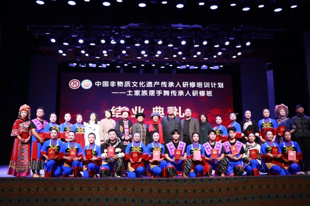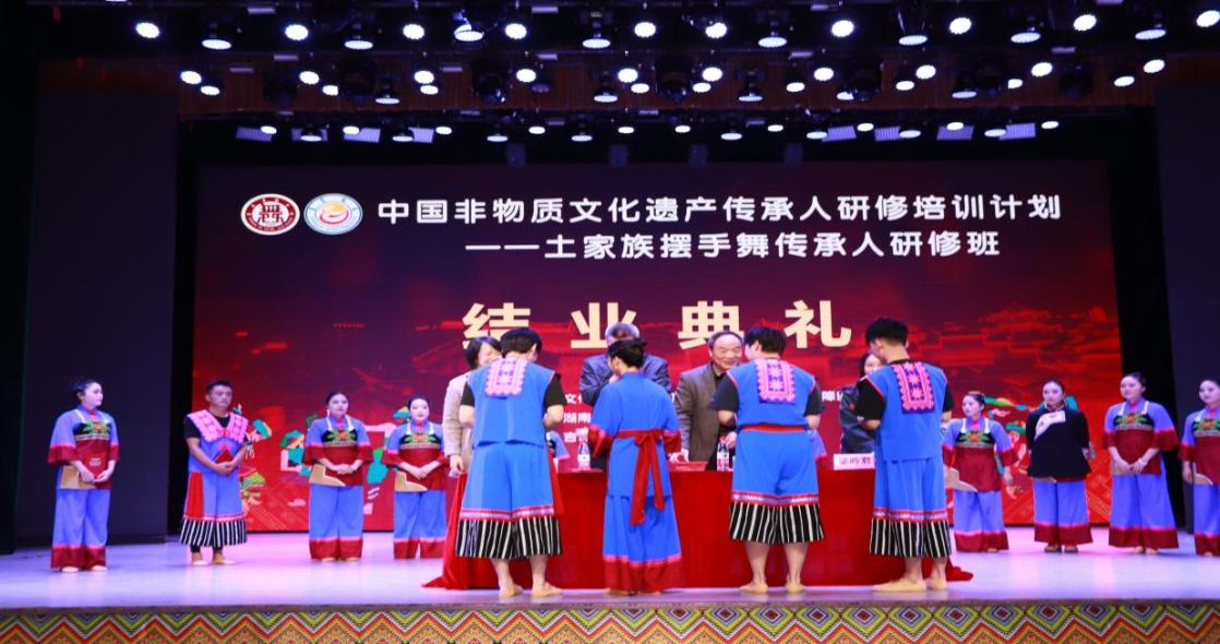 (通讯员:李星星)2025年11月18日下午14:30,由湖南省文化和旅游厅、湘西土家族苗族自治州文化旅游广电局指导,吉首大学主办,吉首大学音乐舞蹈学院承办的“2025年度中国非遗传承人研修培训计划——土家族摆手舞传承人研修班”结业典礼暨汇报展演在吉首大学音乐舞蹈学院实验剧场隆重举行。