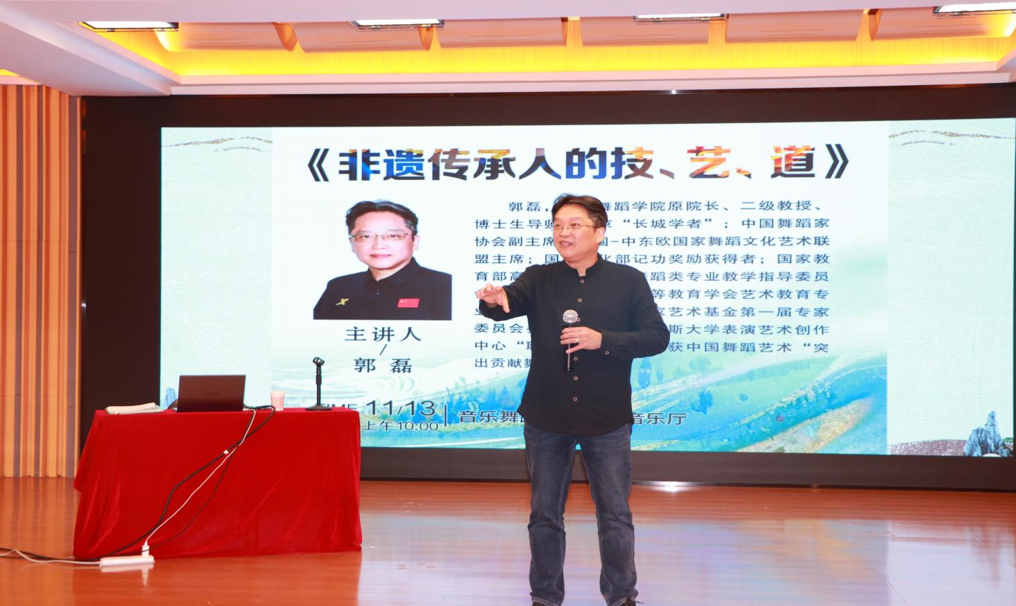 11月13日上午,吉首大学音乐舞蹈学院一楼音乐厅座无虚席,一场聚焦非遗传承的学术盛宴在此拉开帷幕。北京舞蹈学院原院长、二级教授、博士生导师郭磊先生,以《非遗传承人的技、艺、道》为题,带来了一场兼具深度与温度的分享,为现场师生解锁了非遗舞蹈传承与创新的核心密码。本次讲座围绕非遗舞蹈的传承与创新展开,郭磊老师分享了其在江西赣南采茶舞和傩舞中的实践经验,强调了老艺人在非遗传承中的重要作用。同时详细介绍了如何通过创造性转化和创新性发展,将传统舞蹈融入现代舞台艺术,并结合自身经历探讨了非遗舞蹈在教学和创作中的挑战与机遇。此外,还提及他创作的舞剧《井冈山》,通过红色题材与非遗舞蹈的结合,展现了革命文化的艺术魅力,凸显了非遗舞蹈在当代社会中的生命力与价值。