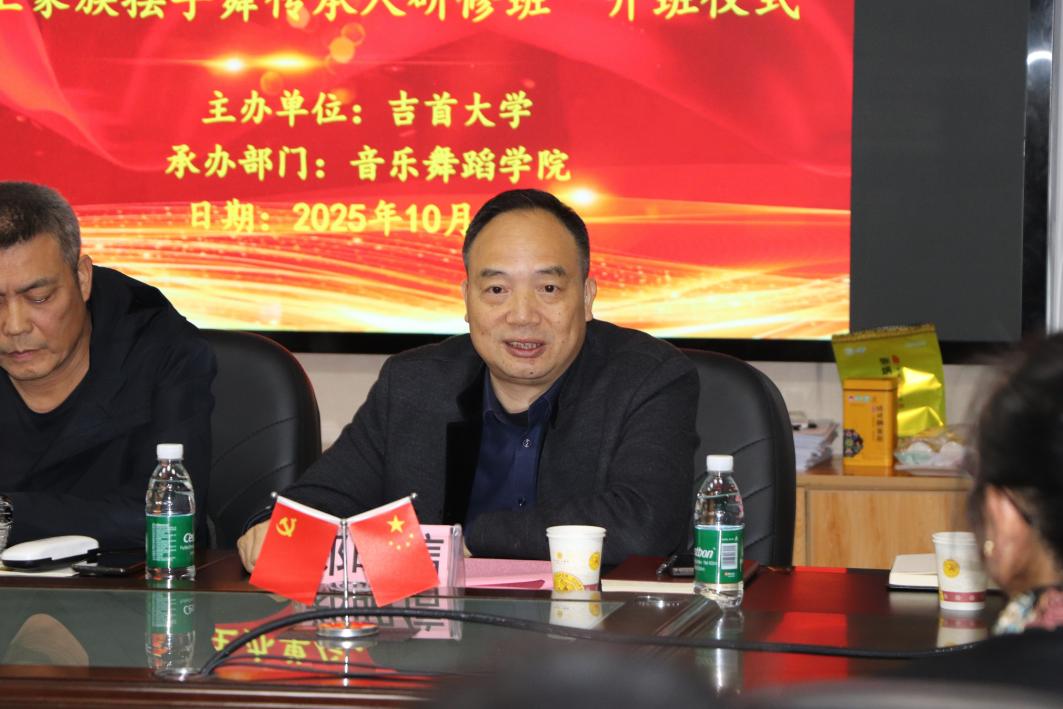 会议由吉首大学音乐舞蹈学院副院长乐之乐教授主持,吉首大学发展规划处处长丁建军、音乐舞蹈学院书记郑昭信、湘西州文化旅游广电局四级调研员王伟、湖南省文化和旅游厅非遗处副处长陈利文,以及教师代表李星星、学员代表梁桂钊先后发言,从政策支持、教学规划、责任担当等维度,为研修班划定方向。