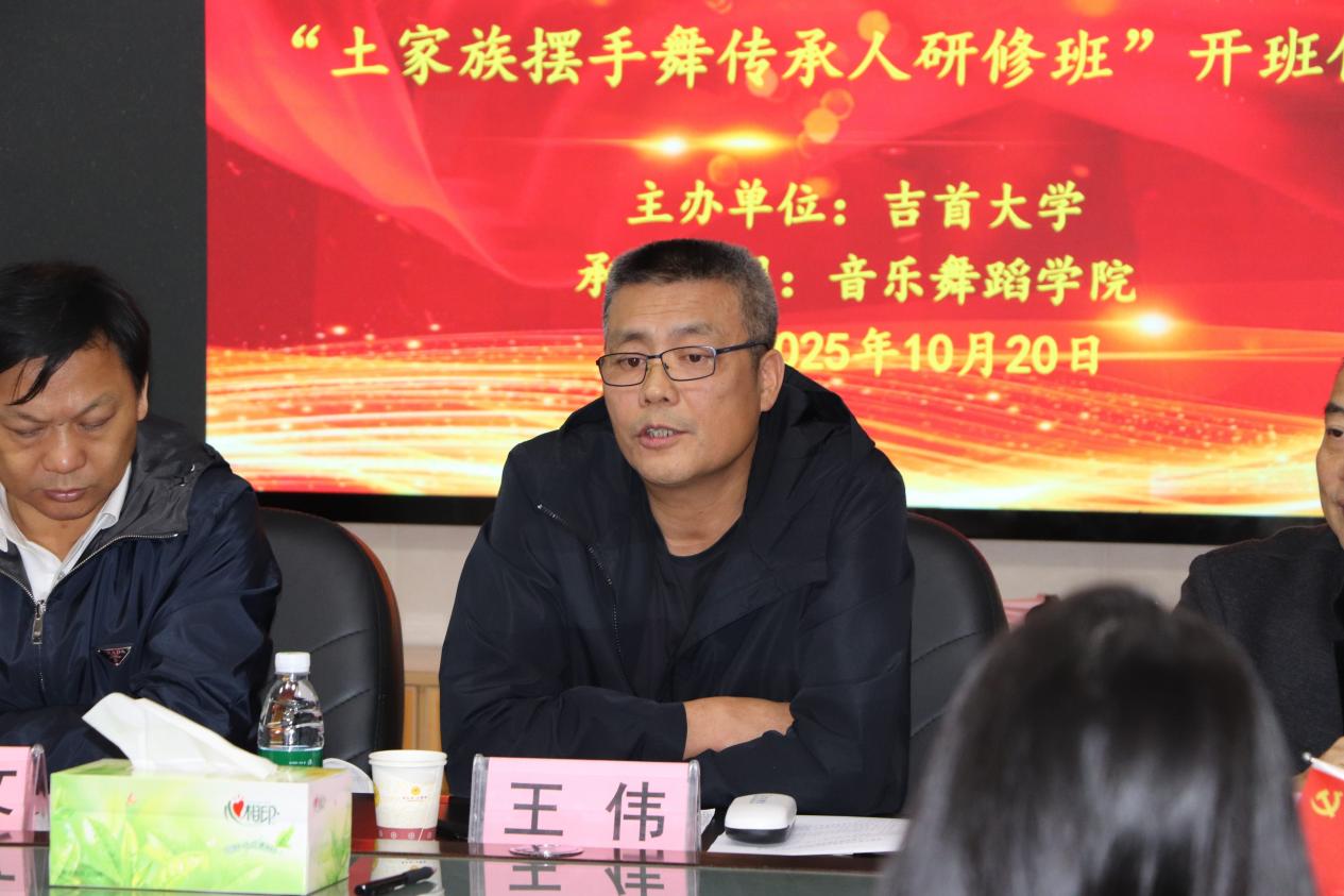 2025年10月20日,吉首大学2025年度“中国非物质文化遗产传承人研修培训计划——土家族摆手舞传承人研修班”顺利开班,本次研修由湖南省文化和旅游厅、湘西土家族苗族自治州文化旅游广电局指导,吉首大学主办,吉首大学音乐舞蹈学院承办。湖南省文化和旅游厅非遗处副处长陈利文、湘西州文化旅游广电局四级调研员王伟、湘西州文化旅游广电局非遗科科长粟吟君、吉首大学发展规划处处长丁建军、吉首大学音乐舞蹈学院书记郑昭信、音乐舞蹈学院副院长乐之乐,以及来自四省边区的25位传承人和研修班教师代表出席开班仪式。