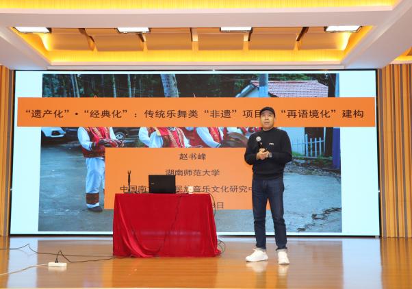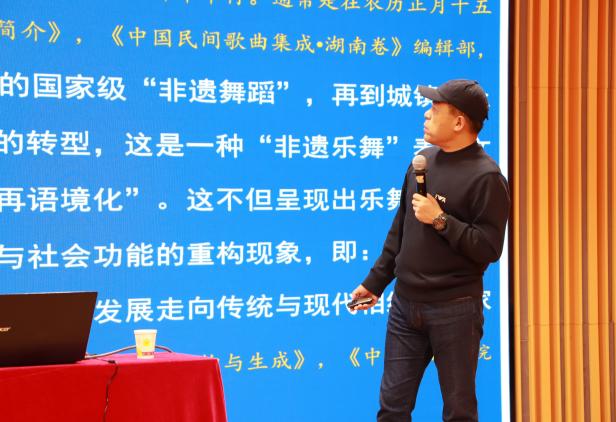 上午的讲座由李星星老师主持,赵教授以“遗产化”“经典化”:传统乐舞类“非遗”项目的“再语境化”建构为核心,从五方面展开解析。他首先分析“再语境化”的实践过程,提出需以“合作人类学”理论为支撑,由传承人、地方非遗保护中心等多方协作,共同构建非遗乐舞文本;还指出传统乐舞会实现“语境跨越”,从民俗仪式场景转向舞台化展演,同步完成传播场景、“演-观”结构、核心表现形式的创新,在适配非遗申报标准与大众审美的同时,坚守传统内核,践行“守正创新”。