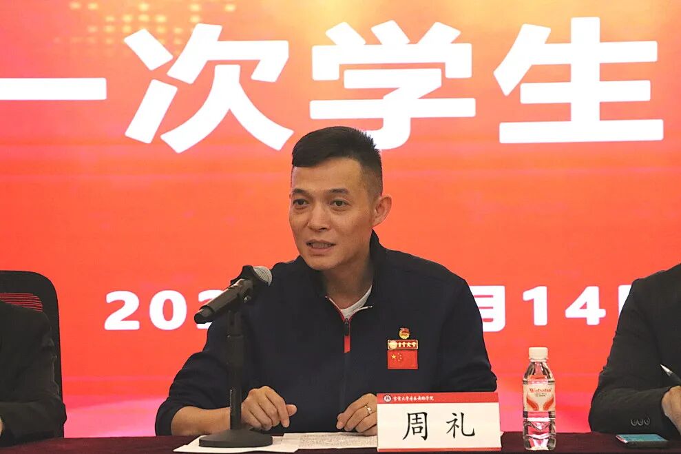 校团委书记周礼老师讲话。他代表校团委对大会的召开致以热烈祝贺,对学院学生会过去一年取得的丰硕成果及全体学生干部的辛勤付出给予了高度肯定。他从深化“六大艺术团”的舞台淬炼功能、发挥美育主力军作用等方面,为学生会工作提供了方向。面对未来,他向全体代表、新一届学生会和全体同学提出四点殷切希望:一是要坚定信念,做红色基因的传承者;二是要勇于探索,做美育非遗的创新践行者;三是要心怀热忱,做服务同学的暖心人;四是要勇担使命,做文化惠民的先行者。